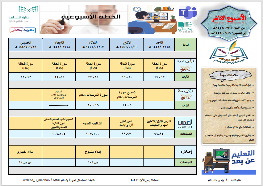 معلم الصفوف الأولية هو ذلك المعلم الذي يعمل بصورة مخطط لها تخطيطا مسبقا في جعل كل ثانية من زمن درسه ذات قيمة لطلابه من واقع إعداد الأنشطة المنوعة والملائمة لكل مجموعة من طلابه حسب قدراتهم لتعمل منسجمة معهذه الأنشطة. 13 ملفات التعليم عن بعد خطة الأسبوع الثامن لمقررات الصفوف الأولية عدد المشاهدات. الفصل الدراسي الاول الصفوف الاولية. منتديات مملكة المعلم ملتقي تربوي هادف يجمع لك اخبار التربية والتعليم وكل ما يخص شون المعلمين والمعلمات والاستشارات التربوية والتعليمية وكل ما يخص الارشاد التربوي والمناهج التعليمية المختلفة ملتقي مملكة المعلم.